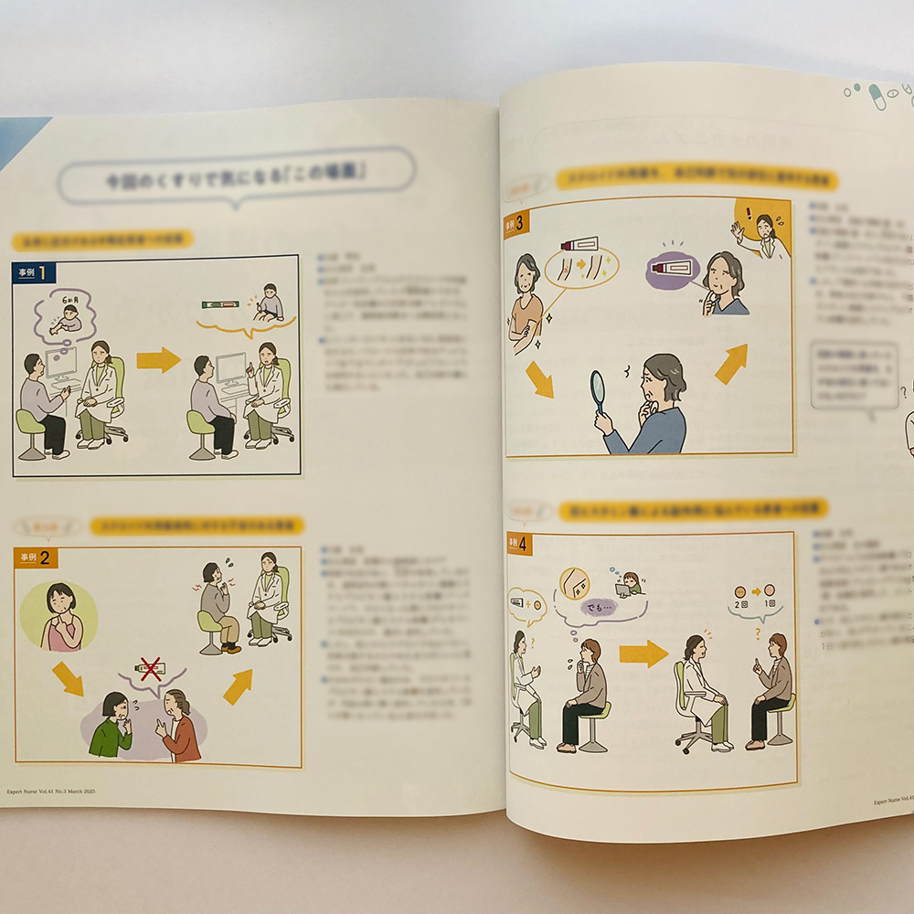 株式会社照林社様より、エキスパートナース3月号掲載の「この場面」の“なぜ?”がわかるくすりの知識 についてのイラスト制作のご依頼をいただきました。